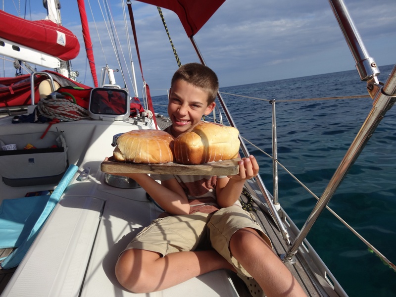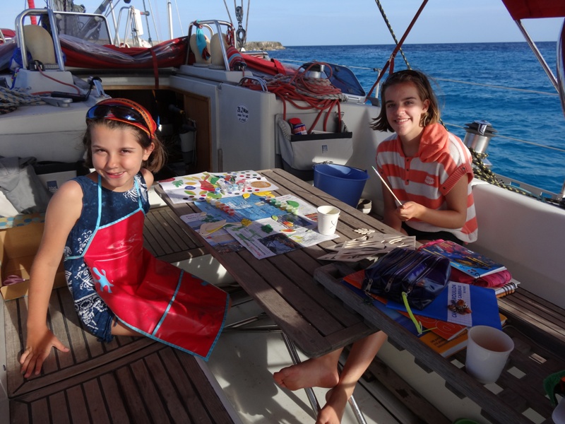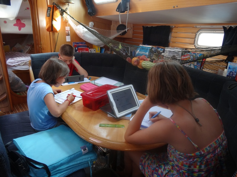 Ce sont aussi les débuts des cours du CNED pour les enfants. Faut bien commencer car en navigation ce n'est pas bien possible de travailler, la houle et le vent ne sont pas propices !