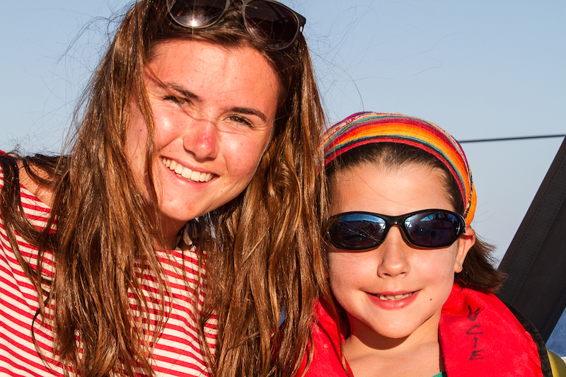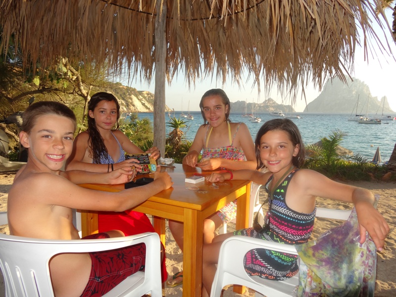 Le lendemain, lever à 2h30 pour attaquer les 90 Mn (arrivée à 17h30) jusqu'à Cala d’Hort à Ibiza où nous attendent Pierre et Patrick (rencontrés pendant le stage Polyester). Ils convoient un bateau des Canaries à Sète. C’est avec plaisir que les enfants profitent de la compagnie de Rosie-Louise (la fille de Pierre) pour jouer aux cartes ou sauter dans l'eau.