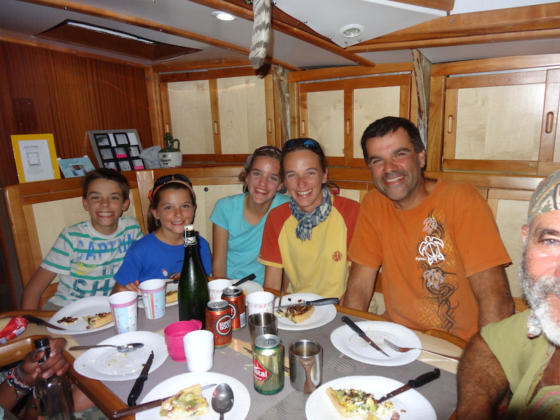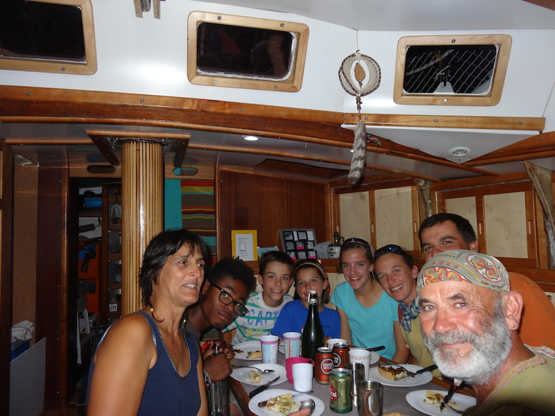 Le retour en annexe s'avère un peu difficile car la marée a encore baissé et la côte est très rocheuse avec vagues et courants en tout sens... YAO nous propose de prendre l'apéro chez eux. Ils nous expliquent qu'ils partent pour un tour du monde (ils ont déjà fait un tour de l'Atlantique quelques années auparavant) et nous finissons autour d'un bon plat de pâtes à la bolognaise maison de Marianne !