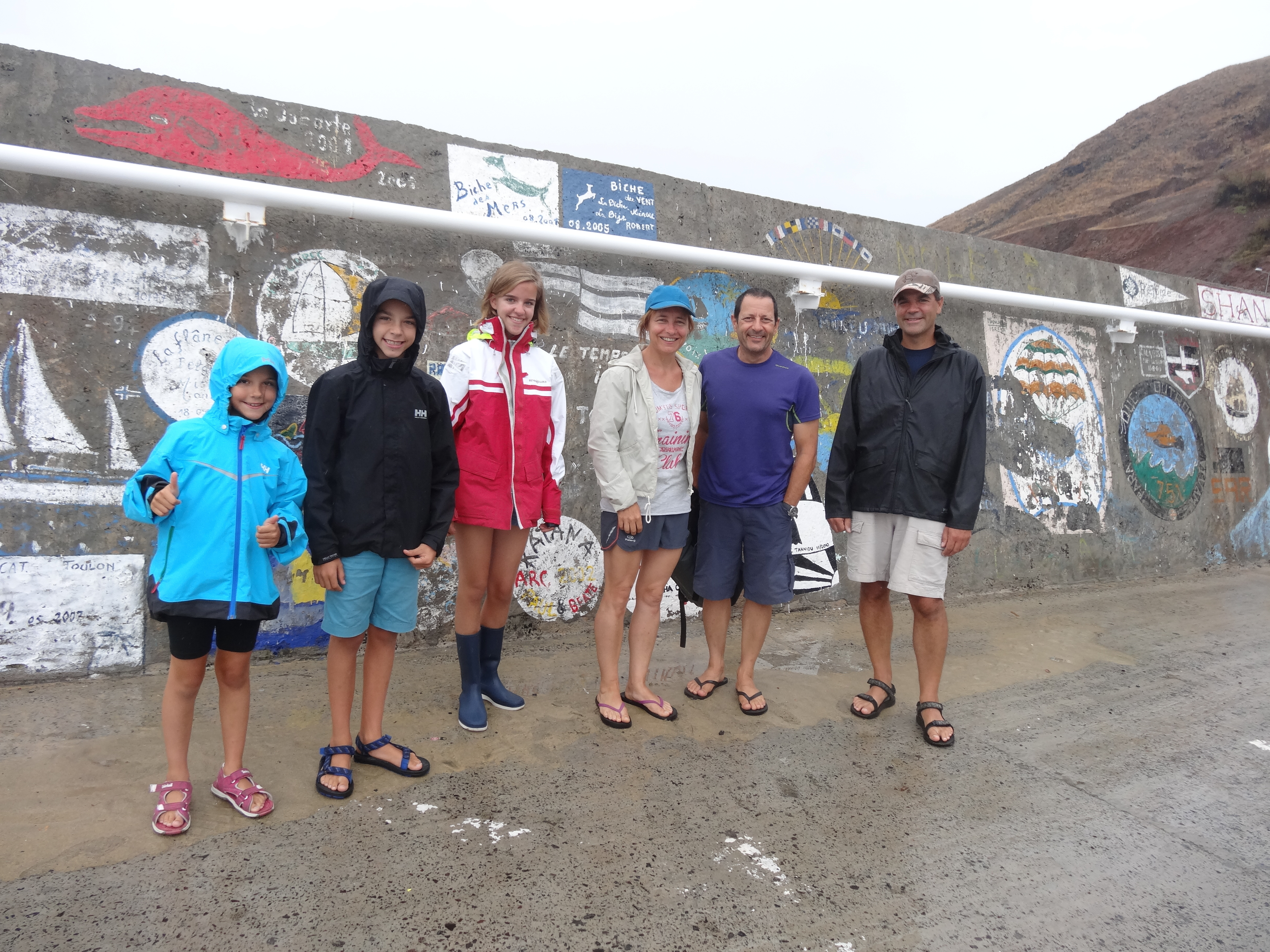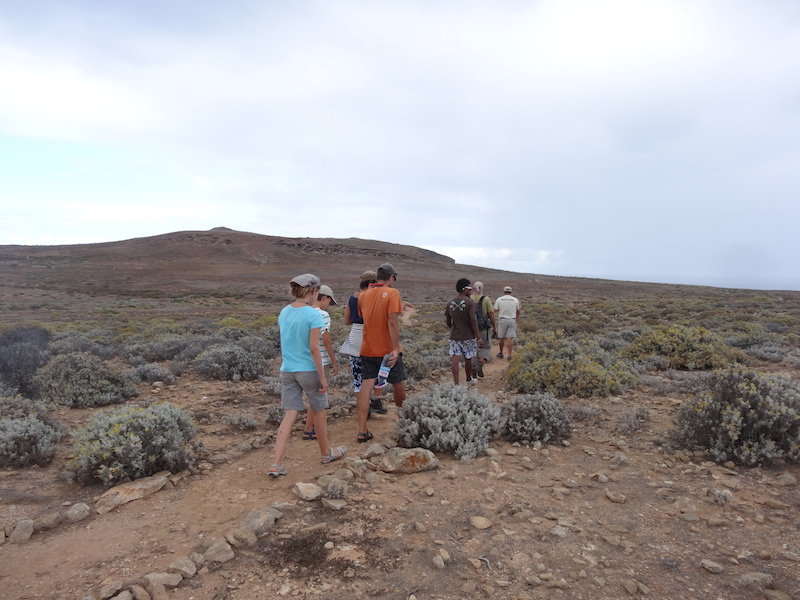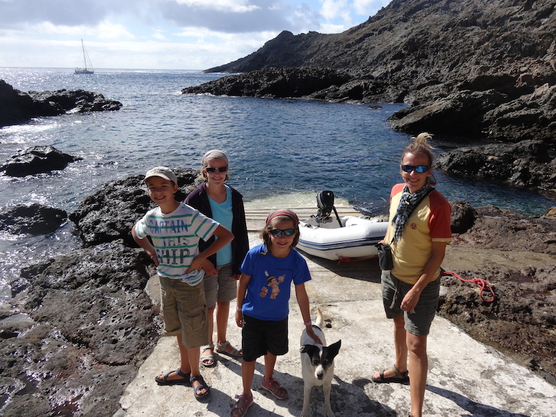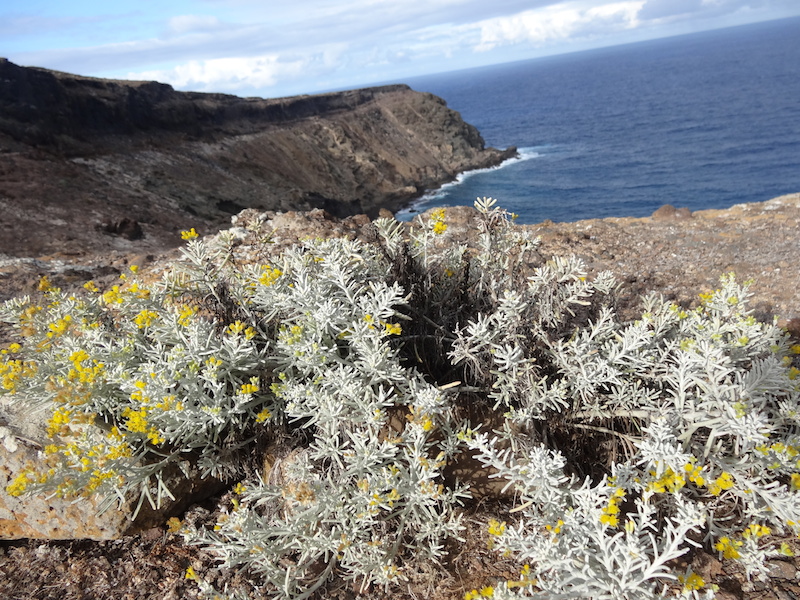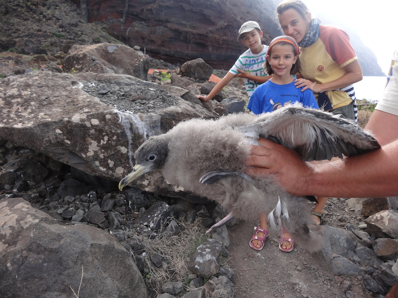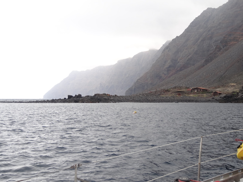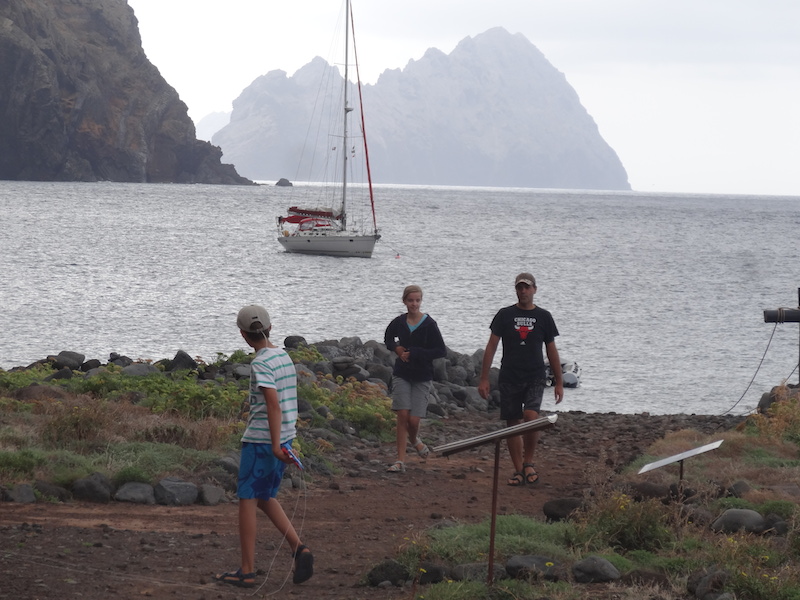 Une scientifique (étudiant les oiseaux) nous accueille et nous offre une tisane. Elle nous explique que cela fait 37 jours qu'ils sont sur l'île et que le lendemain la relève arrive. Du coup, ils sont en plein nettoyage de la maisonnette. Ensuite le gardien de l'île nous emmène pour la promenade avec YAO et le chien Salvagem, seul habitant permanent de l'île. Nous découvrons un plateau avec de petits buissons et une superbe côte déchiquetée par la mer et les vents dominants. A plusieurs reprises nous pouvons observer de jeunes petrels qui nichent dans des trous an attendant de pouvoir prendre leur envol.