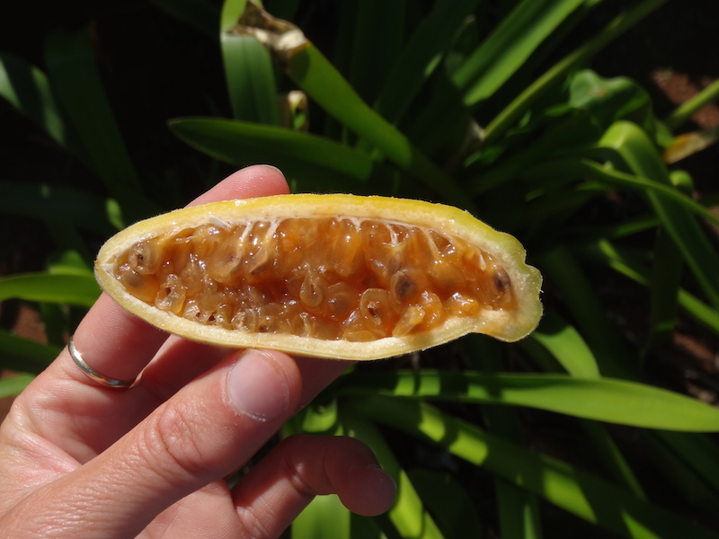 Nous découvrons le "maracuja-banana", un fruit de la passion allongé.