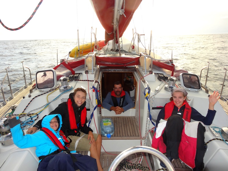 Malheureusement, la houle de 3-4 mètres, courte pour l'Atlantique, ne nous ménage pas. Au près avec force 5 à 6, la navigation est rude. Il faut tirer des bords... Et les estomacs (restés à terre si longtemps) ont du mal à supporter... Un mal de mer prend Maël et Laurence en traitre et ne les laisse pas tranquilles.
