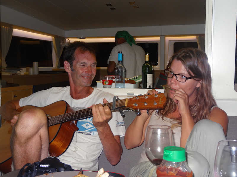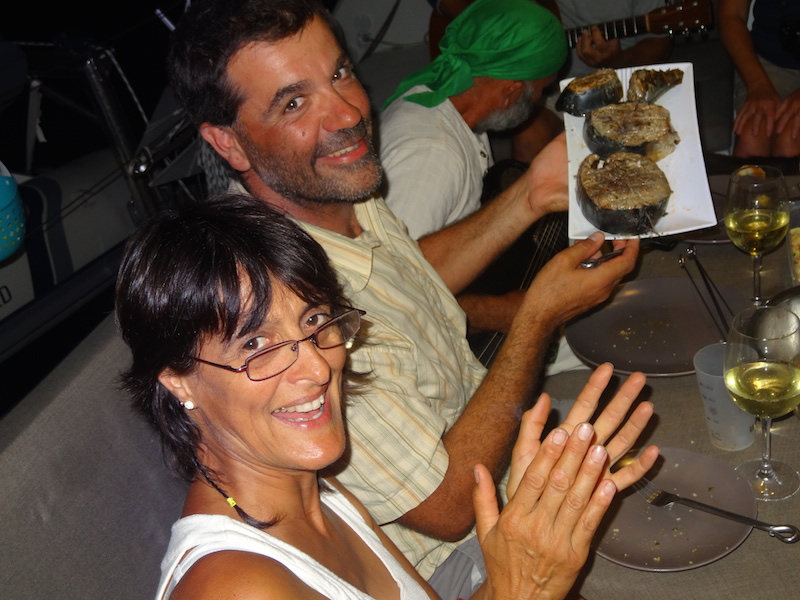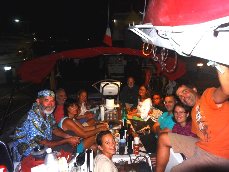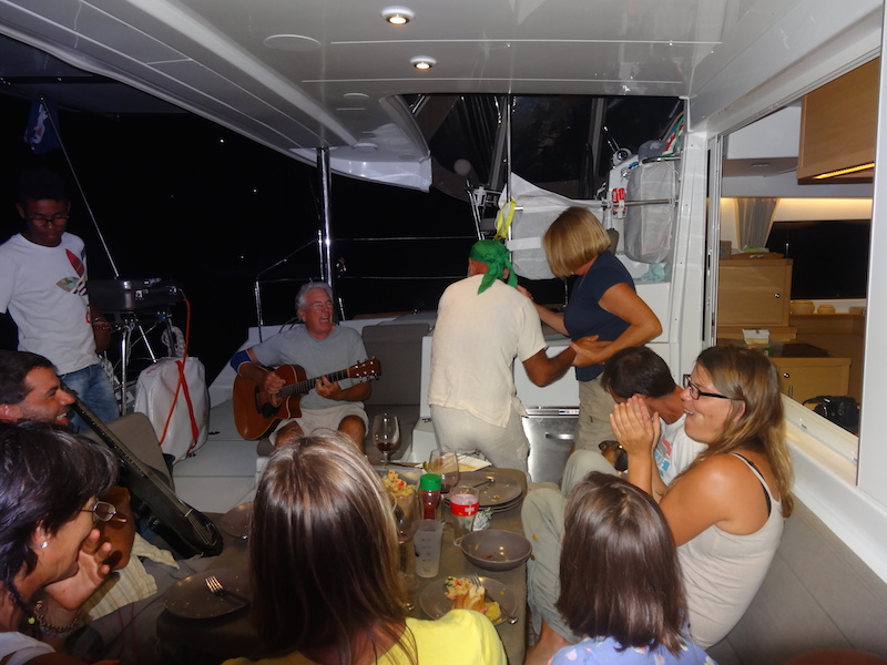 Le soir, nous nous retrouvons tous pour de bonnes grillades sur le catamaran Sephina. L'équipage américain de La Luna nous rejoint aussi. Et c'est autour de chants, guitares, harmonica, accordéon, brochettes au curry, thon au barbecue, salades... que nous passons une excellente soirée !!!