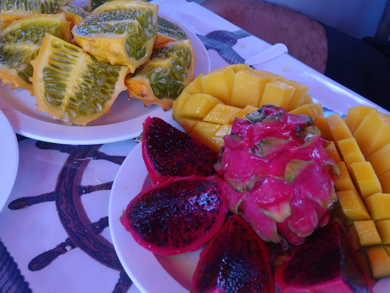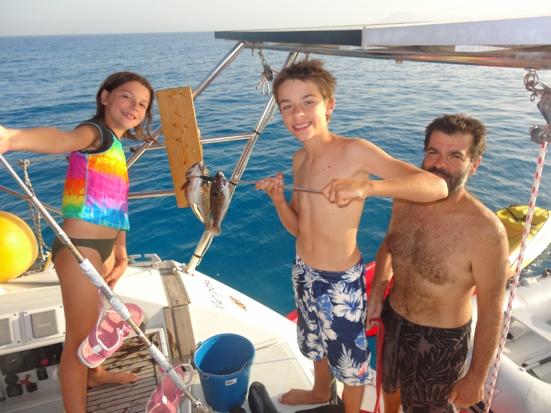 Au retour les plus vaillants s'attaquent à une partie de pêche au harpon. Ils reviennent avec 3 poissons. L'énorme raie aperçue la veille n'est plus dans les parages... Dommage ! Cela ne donnera qu'une bouchée pour la mise en bouche de chacun des 11 mais c'est sympa tout de même de déguster ces poissons qui... quelques heures auparavant nageaient encore dans l'eau.