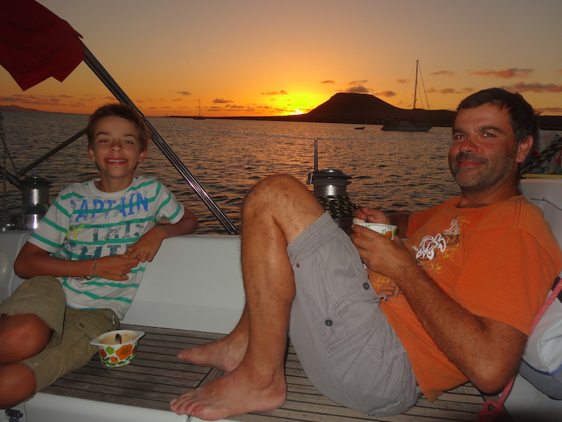 Une petite navigation de 2h au moteur et avec de la houle puis nous arrivons au mouillage de Isla de Los Lobos. Oh ben dis donc, la houle nous secoue... Maël n'est pas content ! Il veut aller à terre pour finir ses cours du Cned. Avec Loïc, ils partent donc en kayak pour travailler un peu. Les derniers bateaux de touristes amarrés aux bouées s'en vont... Nous sommes seuls, ça bouge toujours... La nuit tombe et finalement 2 autres bateaux nous rejoignent pour passer la nuit.