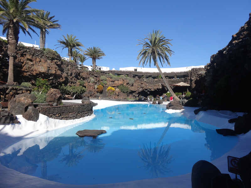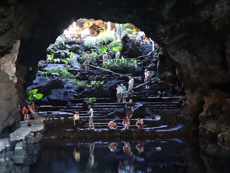 Puis nous terminons par la visite à Jameos del Agua, où César Manrique, un artiste local (ayant côtoyé Nelson Rockefeller, Andy Warhol...) a su allier nature et art en aménageant ces cavités souterraines avec végétation, pierres volcaniques, musique... d'où se dégage une atmosphère de quiétude. On y découvre également une surprenante piscine et une incroyable salle de concert de 600 places.