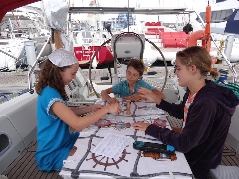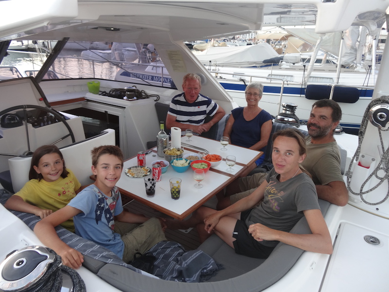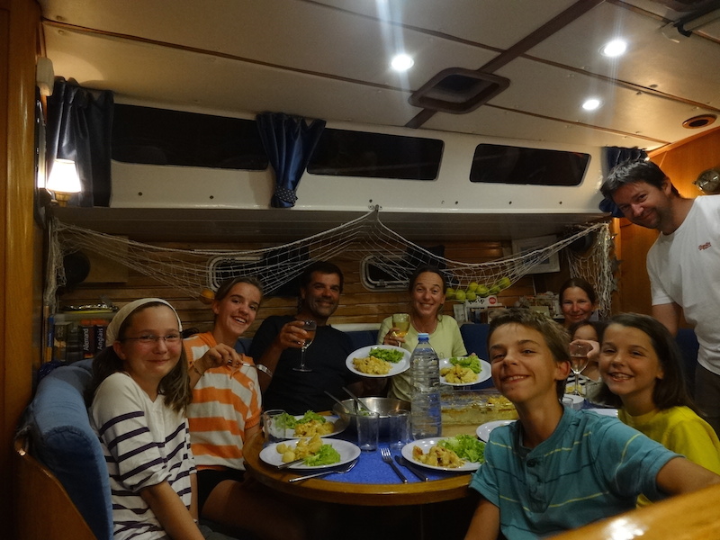 Le soir apéro-pizzas-party organisé par Marianne avec un couple de canadiens et un autre d'anglais. Yann et Flo-flo sont tout de suite mis dans le bain avec cette ambiance de navigateurs, accompagnée de toutes les anecdotes des uns et des autres au fil de l'eau (pendant que les enfants regardent un film).