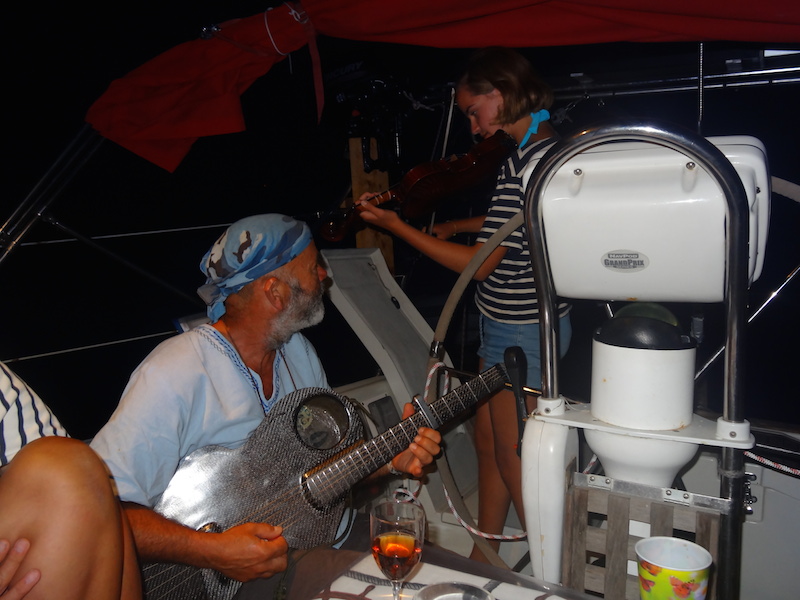 Un soir YAO vient prendre l'apéro et Lucie leur prépare des galettes de pommes de terre. Marianne apporte les carnets de chants et Jean-Loup vient avec sa guitare pour jouer avec Louise qui sort son violon. Nous passons un agréable moment jusque tard dans la nuit.
