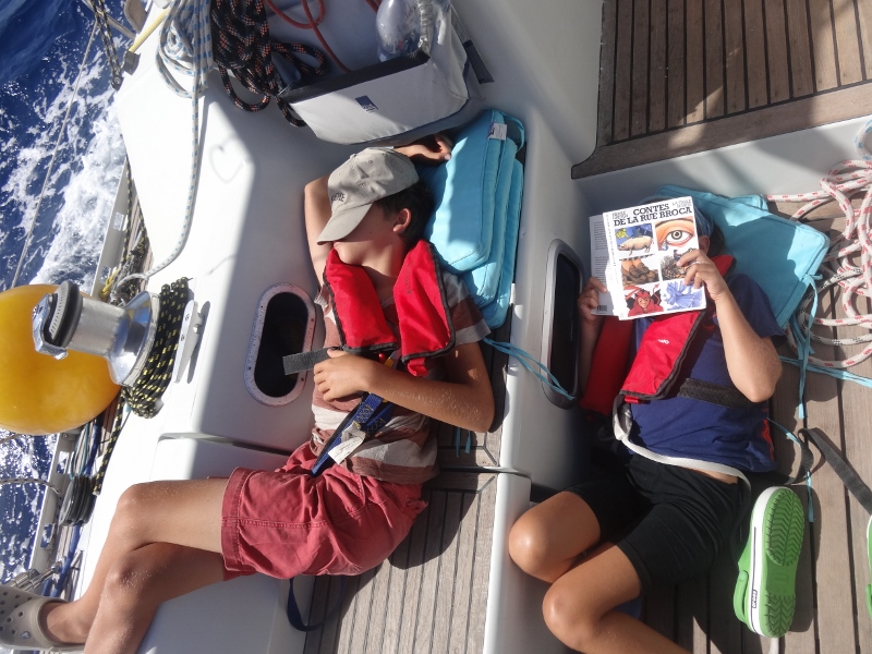 Louise et Maël prennent leur premier quart de 20h à 23h pendant que Loïc dort dans le carré. Puis Loïc veille de jusque vers 3h30 et enfin c'est au tour de Lolo.
