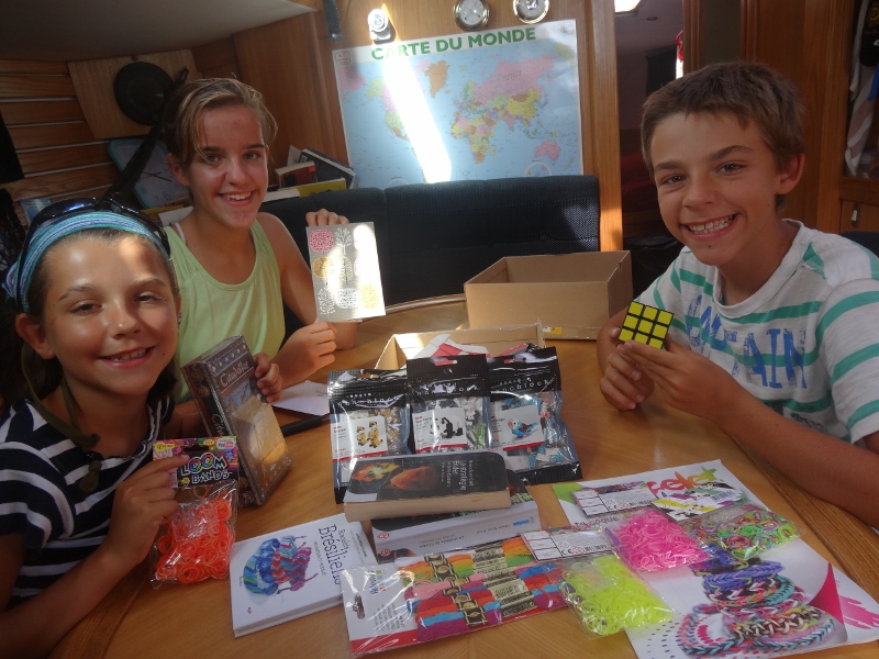 Quelle n'est pas notre surprise lorsque le gars de la marina, nous apporte un paquet nous étant destiné ! Les enfants sont contents... et nous aussi. David et Gaby nous ont envoyés pleins de petites choses pour ne pas nous ennuyer (mini-legos, bracelets brésiliens, livres, rubicks cube, pain d'épices...), c'est super chouette !