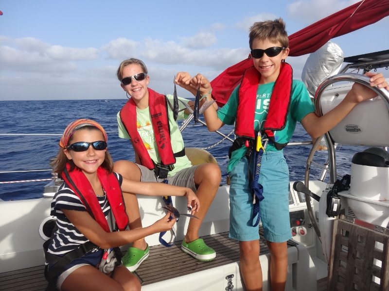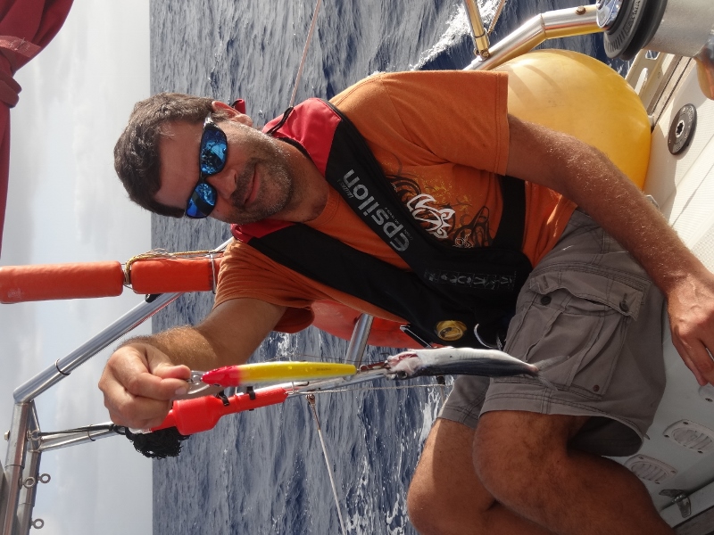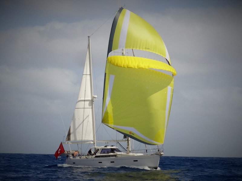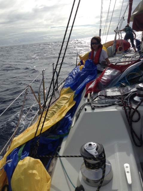 Nous commençons 2 jours sous spi seul, puis 2 jours grand largue et enfin 2 jours vent arrière en ciseaux avec génois tangonné et retenue de bôme.