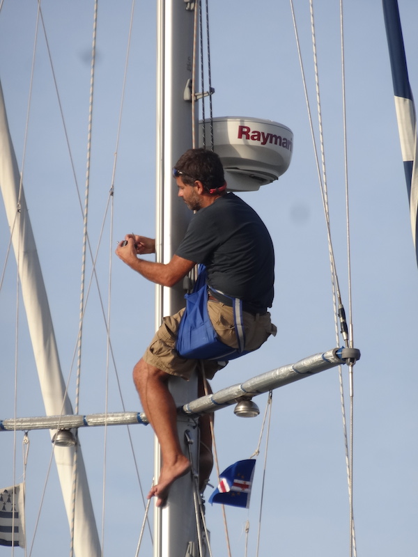 Pour l'aider à faire quelques vérifications, Loïc monte au mat de Jacques.