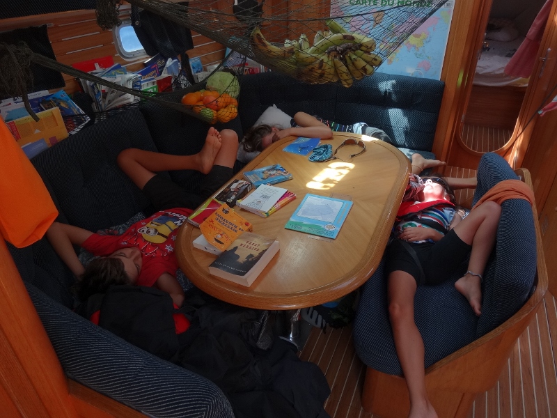 Quand la houle est forte, les enfants s'allongent à l'intérieur et écoutent des CDs audio. Dommage que nous n'ayons pas emmené plus de CD d'histoires...