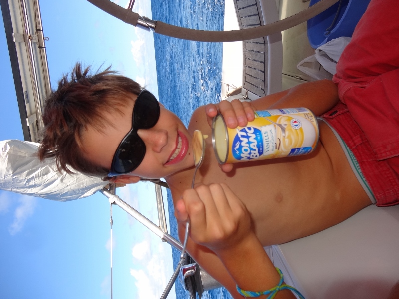 Vers la fin du trajet, les fruits et légumes frais se sont épuisés. Maël découvre avec plaisir les boîtes de conserves. Mmmmh c'est trop bon la crème Mont Blanc !