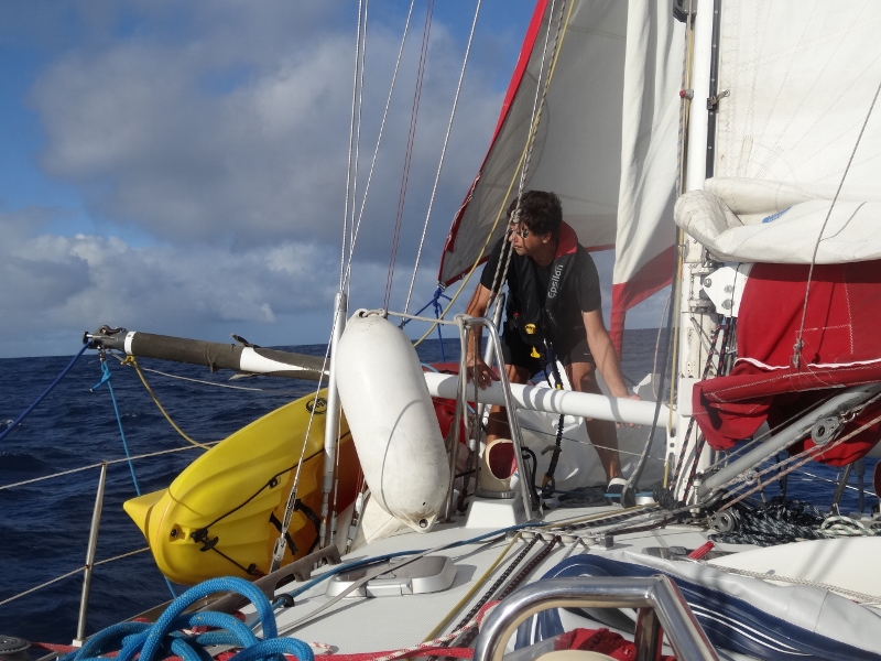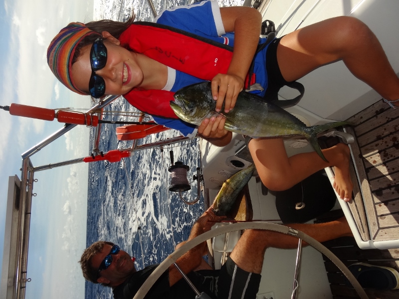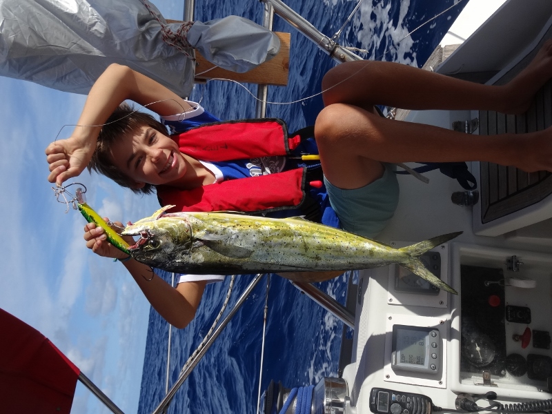 Nous mettons la traine à l'eau. Et nous pêchons 3 dorades coryphènes dont une de 74 cm. Cela agrémente bien nos repas !