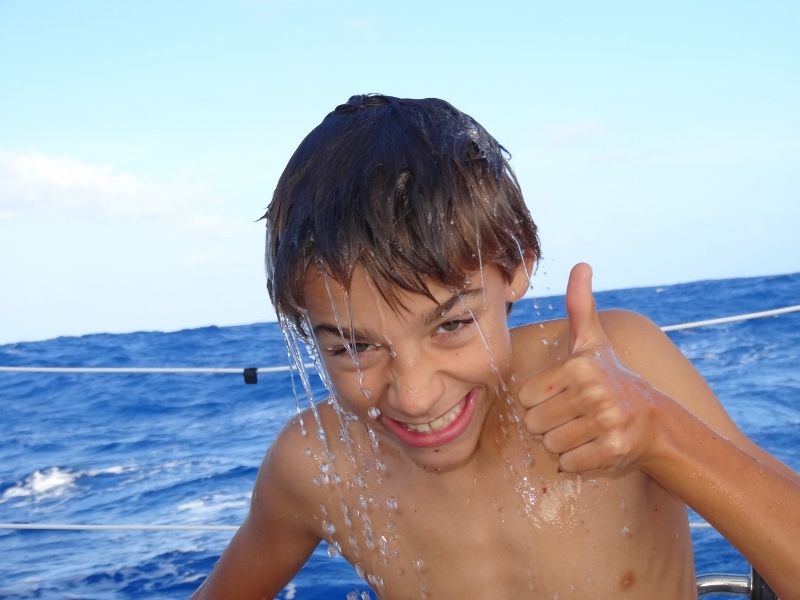 Le matin du 6ème jour nous entendons du bruit sur la VHF. Louise s'exclame "oh il doit y avoir quelqu'un dans les parages !"... Puis quelques secondes plus tard nous entendons "Sailing boat aproximate position ...N 38º...W, do you read me ?". On n'avait pas bien écouté la position... " Sailing boat aproximate position 15º02N 38º57W, do you read me ?" Mais c'est nous !!!
