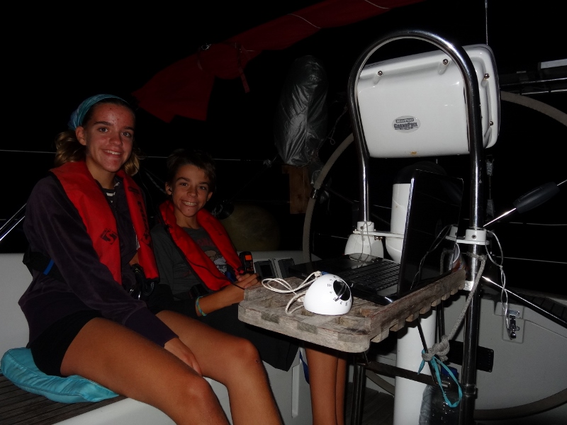 Ils en profitent pour regarder un film sur l'ordinateur en mettant en route le compte minutes pour faire régulièrement une vérification du vent, des voiles, de l'AIS et un coup d'oeil à l'horizon.