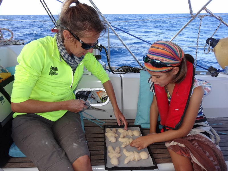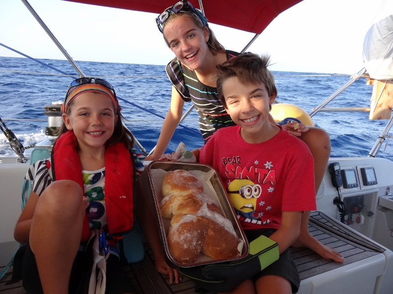 Puis en début d'après-m, c'est l'heure de larguer les amarres. Méléos nous offre un cadeau de départ : une belle brioche aux raisins toute chaude ! Nous la dégusterons après notre première nuit en mer. Mmmmmmmhhhhh !!!! Trop trop bon !