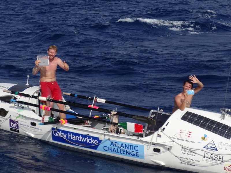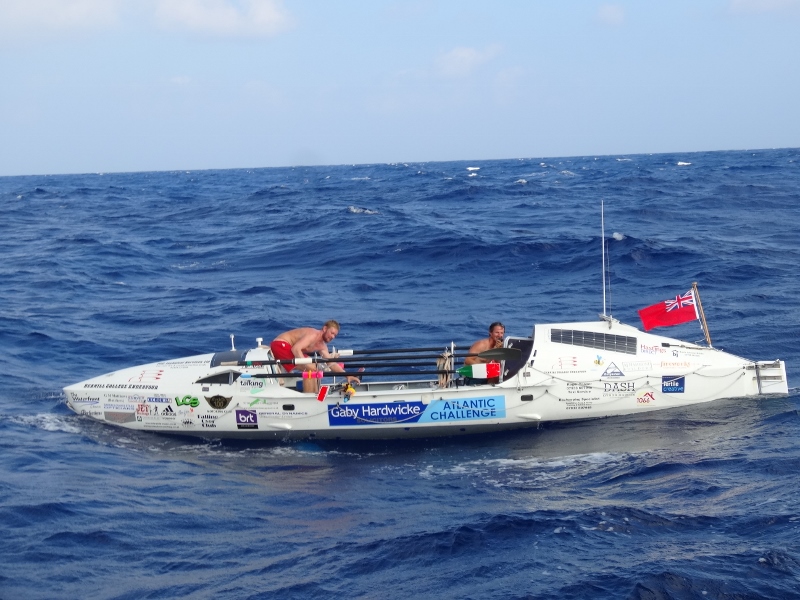 Ils nous demandent de nous rapprocher d'eux pour les prendre en photos. C'est bizare, on ne voit rien à l'horizon... Puis tout à coup nous distinguons une "coquille de noix" avec 2 rameurs. Ils sont partis des Canaries depuis 28 jours et comptent arriver à La Barbade après 45 jours de mer. Incroyable !
