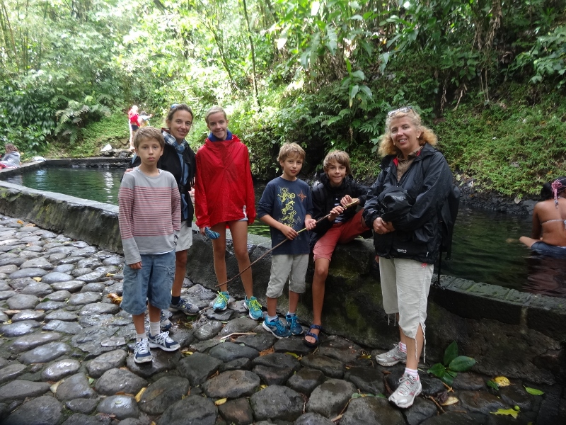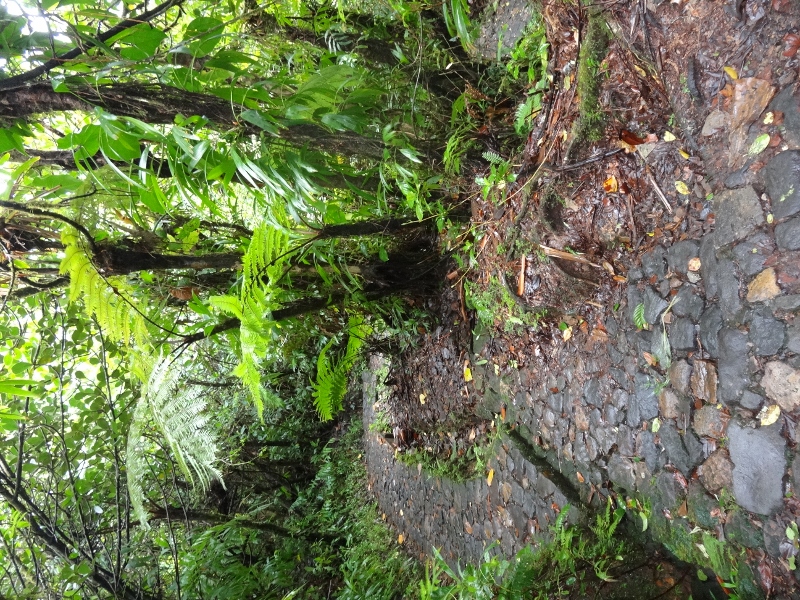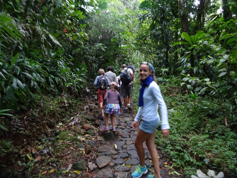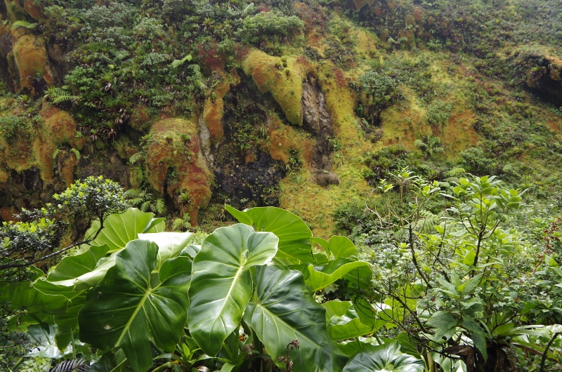 Nous partons des "bains jaunes", aux eaux tièdes, pour suivre un chemin pavé au milieu de lianes, fougères et plantes aux feuilles énormes. Arrivés à une espèce de clairière, la végétation se fait plus "basse" avec des gros buissons.