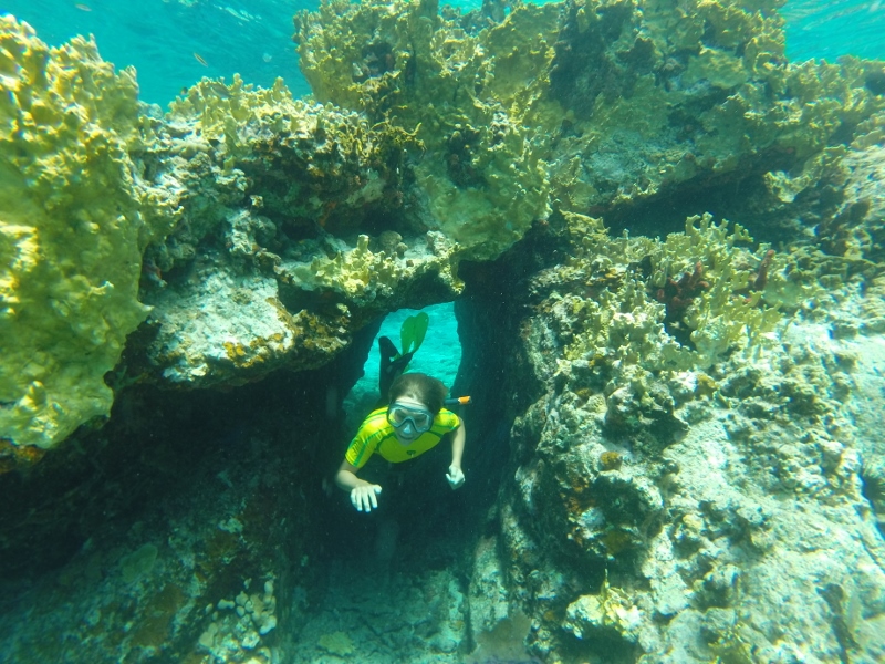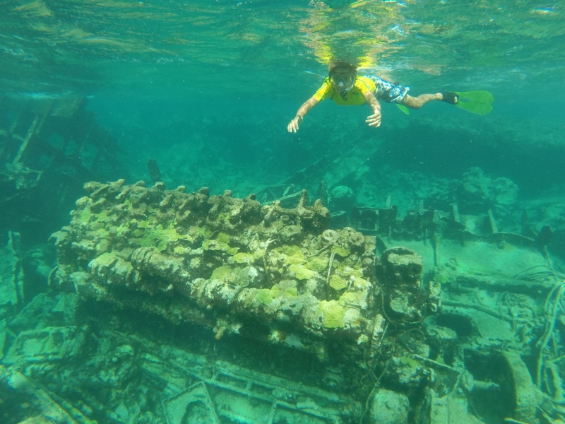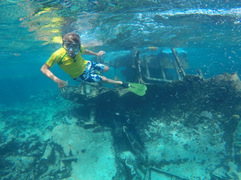 En arrivant tout à l'est d'Anegada, dans la barrière de corail d'Horse Shoe Reef, l'eau est vraiment turquoise. Nous mouillons là loin de la terre par 3,5m de fond. Nous sommes seuls et l'endroit est vraiment magnifique ! Dans l'après-midi un peu de snorkelling puis le lendemain matin, Maël et Loïc vont à la recherche d'une vieille épave qui est supposée être dans le coin.