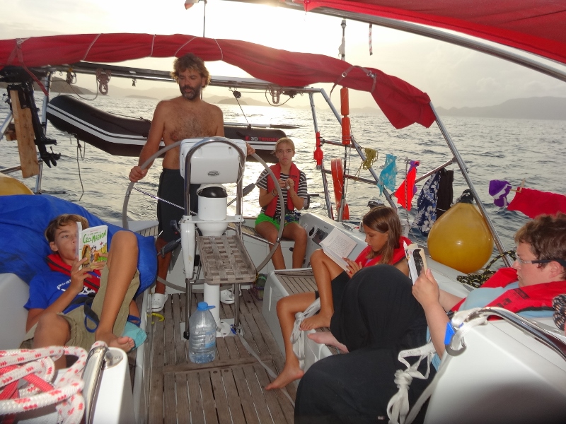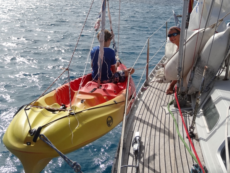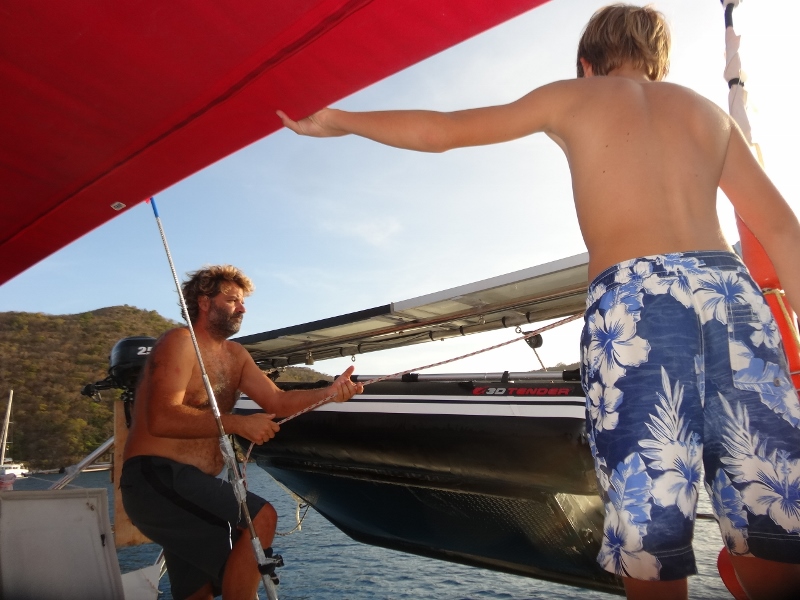 Pour toutes les navigations un peu longues, il faut remonter l'annexe et son moteur à l'arrière.