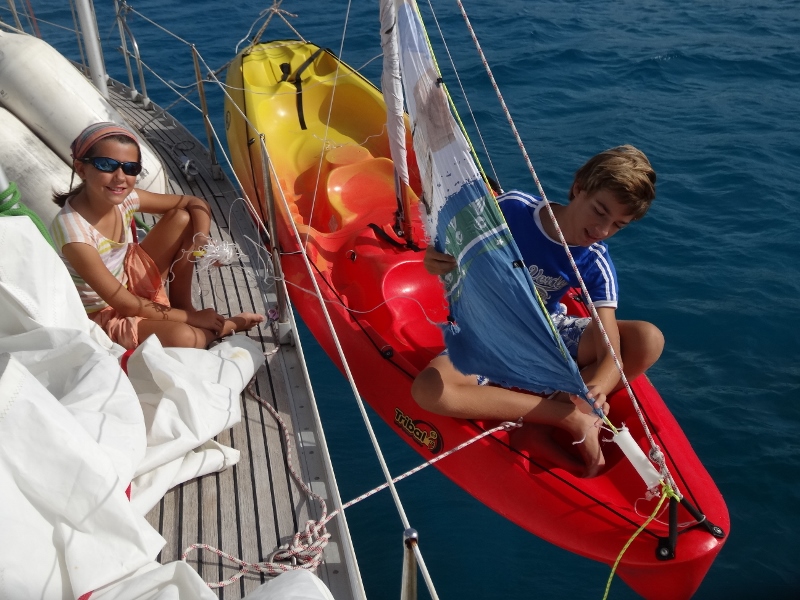 Cela n'empêche pas de s'amuser. D'ailleurs, les enfants remarquent qu'Angélus, que nous avions vaguement croisé à Rabat, est également au mouillage. Chouette des copains !