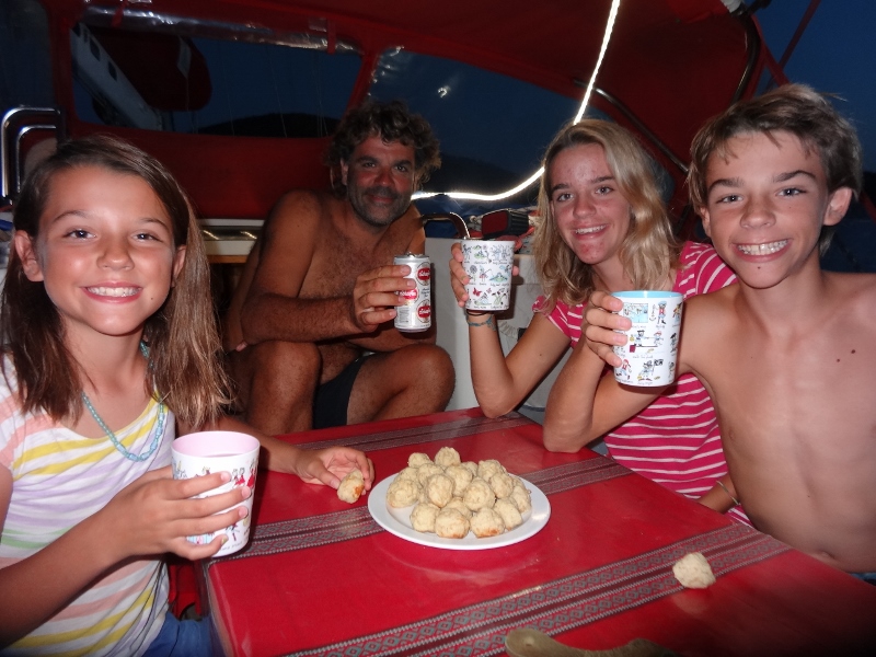 Le soir, après la douche, Louise décide de nous préparer des "paes de queijo" avec la farine de manioc que nous avons achetée. As veces ela tem saudade da comida brasileira... Tout le monde se régale !