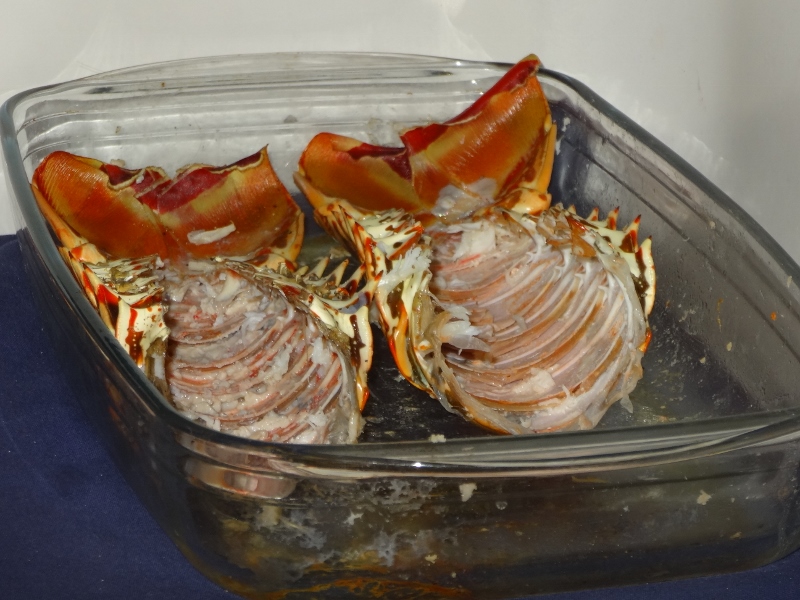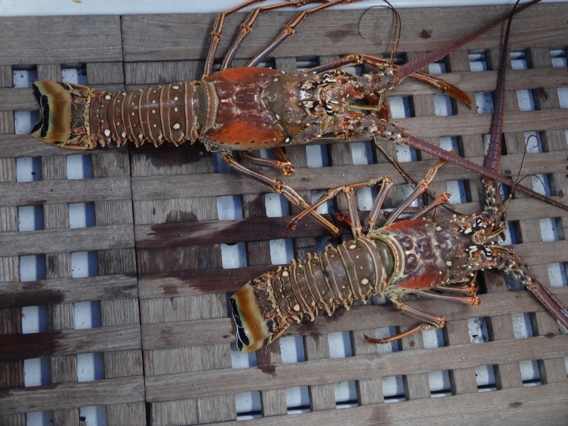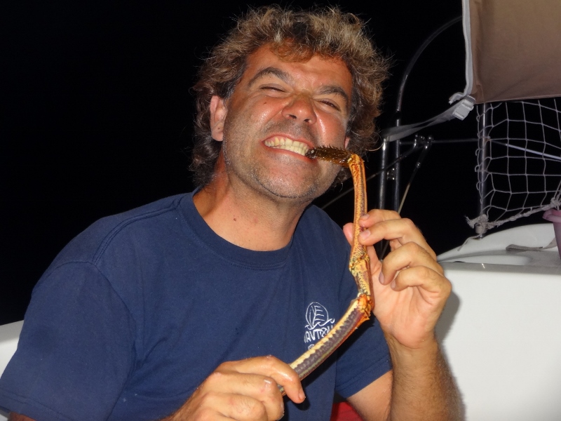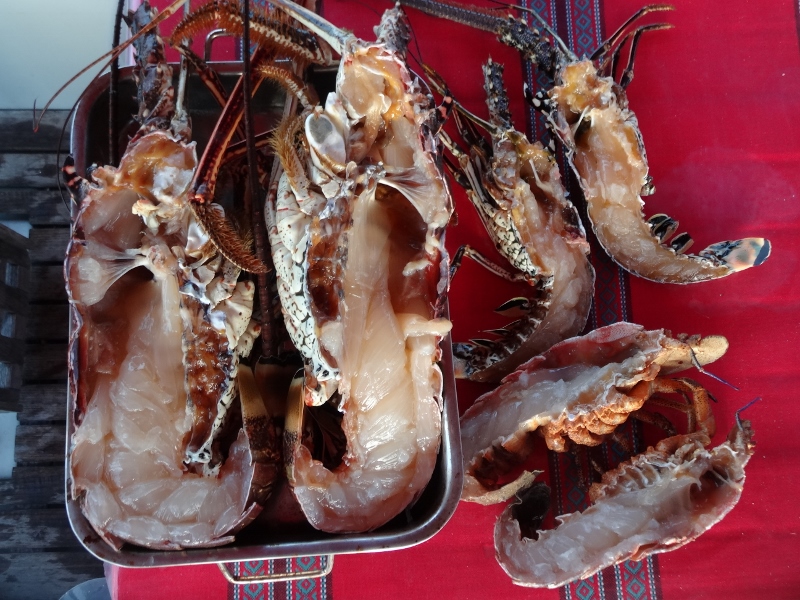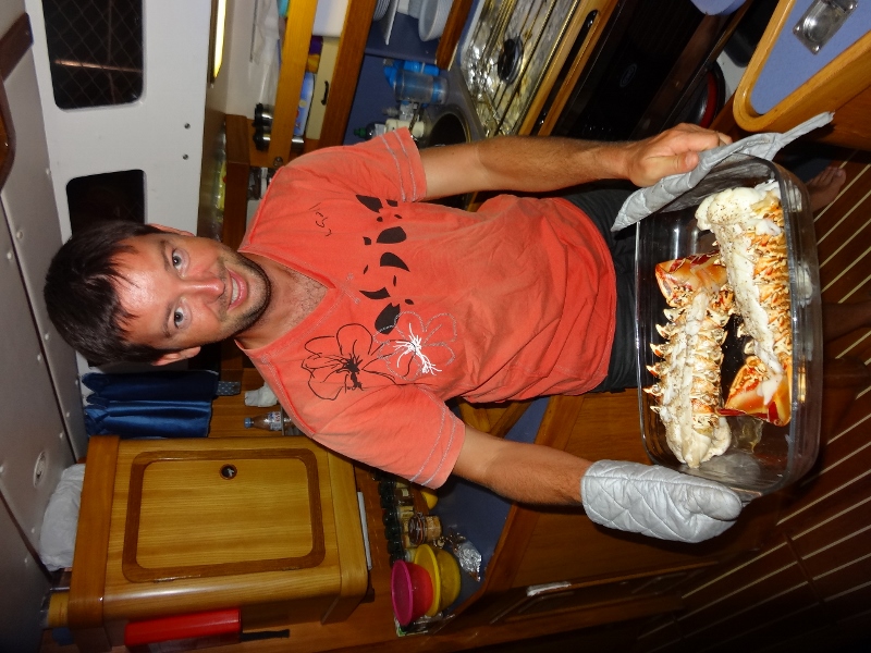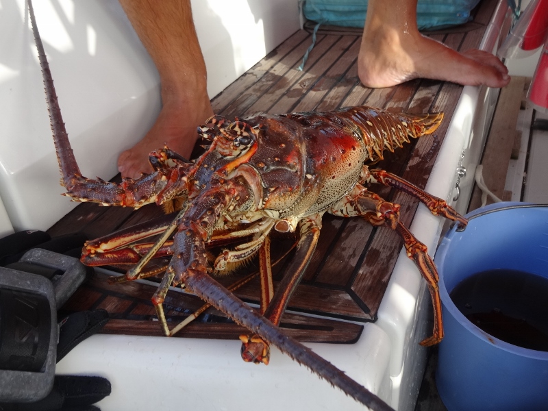 3 langoustes (dont une énooorme !) et 2 cigales : la pêche était bonne !!! Nous les dégustons avec Angélus et Ben.