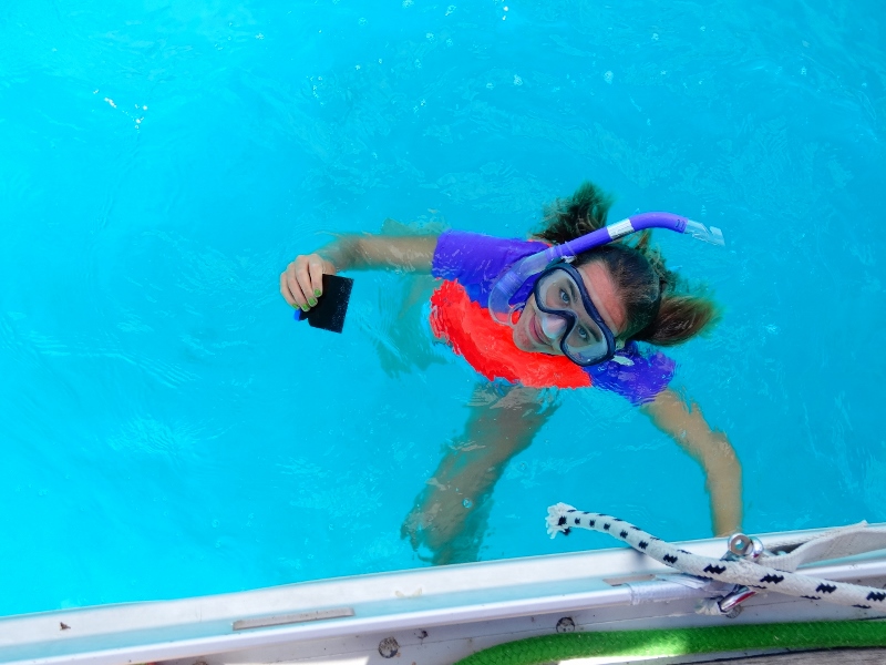 Une nouvelle petite séance de grattage d'algues sur la coque, le safran et la quille est nécessaire. Louise et Maël mettent la main à la "grattounette" !