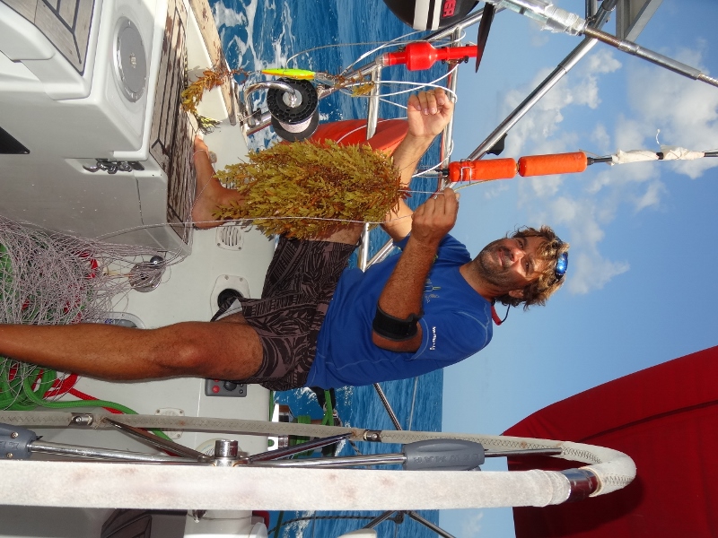 Et c'est parti pour 4h de navigation. Louise et Maël barrent un peu et Loïc continue à pêcher... de la sargasse !