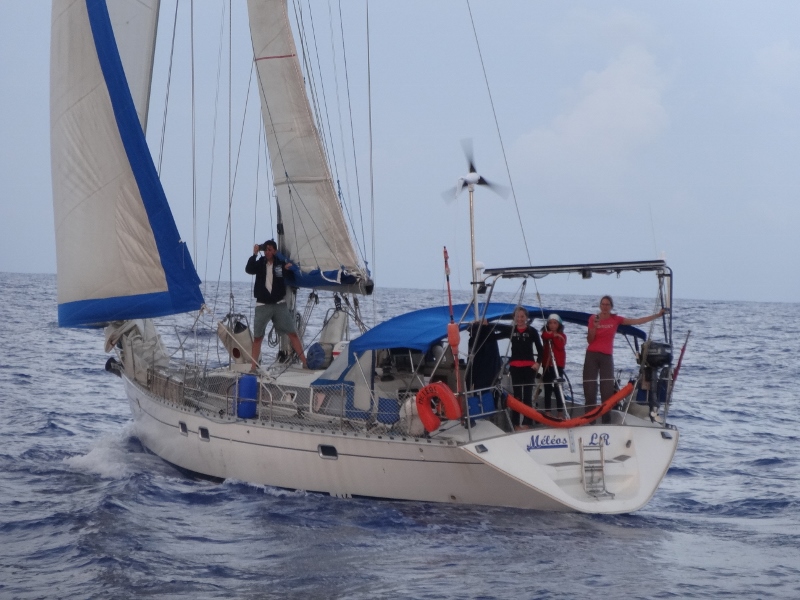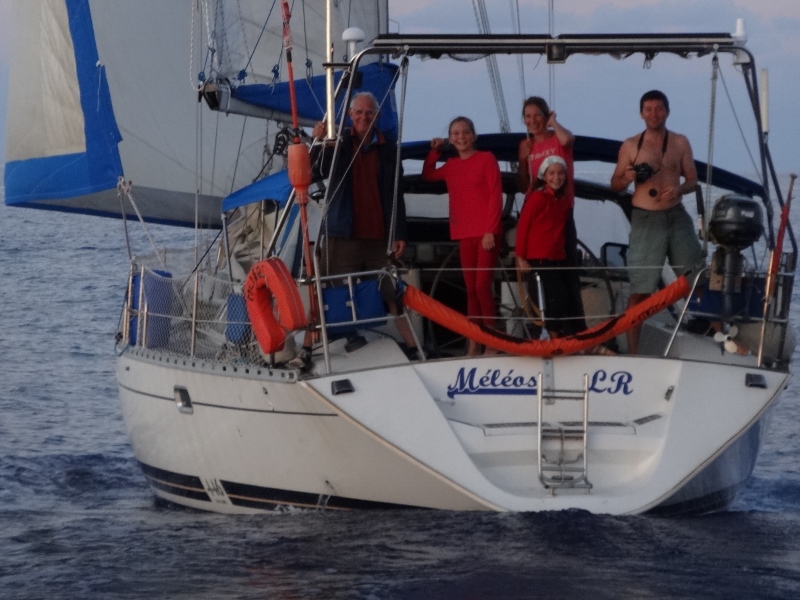 Le jour s'est levé depuis une petite heure. Nous avançons au moteur cette fois car le vent est faible. Le bruit du moteur n'est pas très agréable mais au moins nous avançons. Une petite houle arrivant par l'arrière nous fait monter et descendre. Nos copains sur Méléos sont toujours à 3-4 milles nautiques de nous.