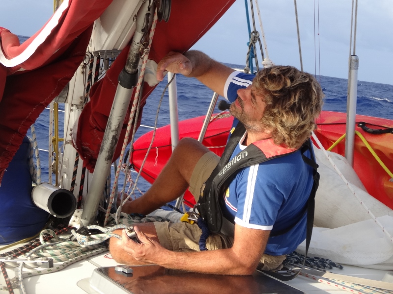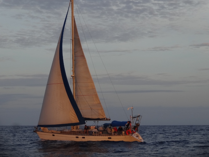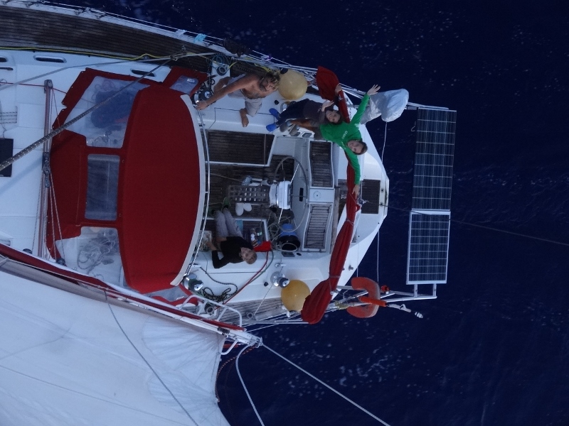 Après un début de transat plutôt musclé, nous sommes maintenant dans une période bien plus agréable. Le vent a faibli (Force 3-4), la mer est belle et nous avançons tout de même bien à la voile (4-5 Nds). Tout le monde apprécie ! Et en plus le soleil est de la partie.