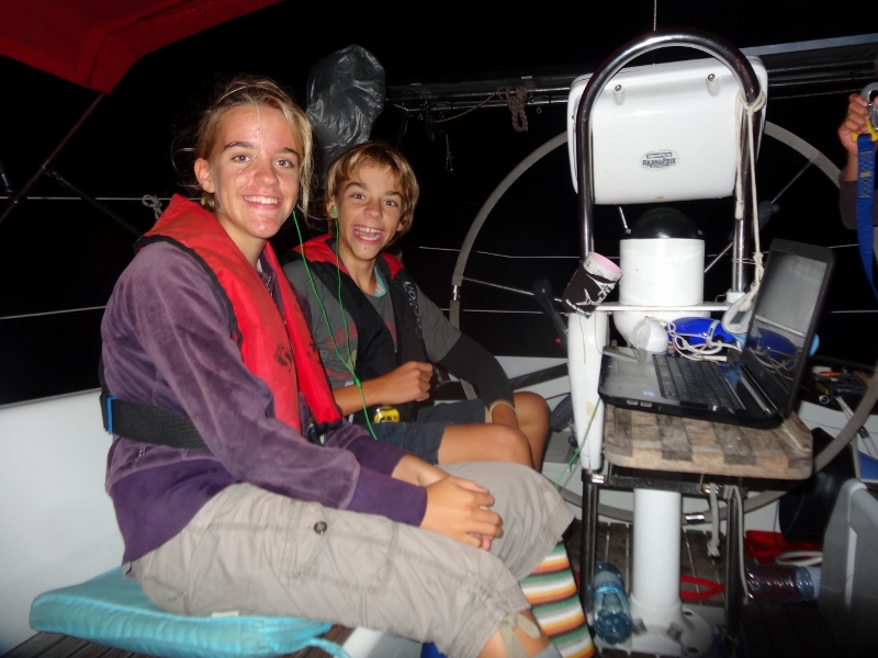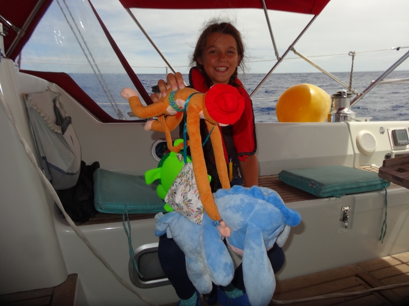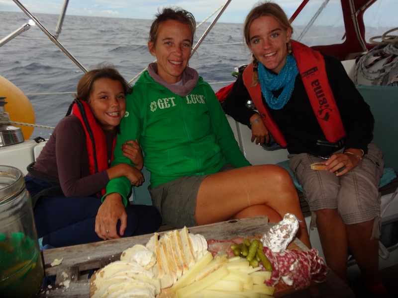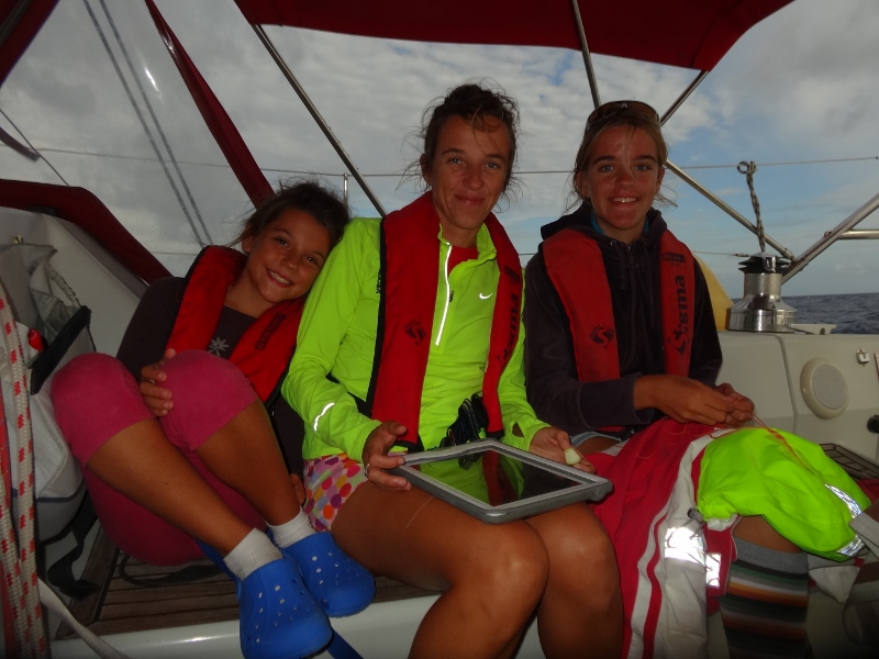 Du coup, on se sent moins seuls sur cette grande étendue d'eau... Nous communiquons bien 3-4 fois par jour par radio VHF. Les capitaines s'échangent des infos techniques(météo, réglage des voiles, soucis techniques...), Lucie et Eléa ont commencé à jouer aux charades, Louise et Cléo ont attaqué une bataille navale et nous nous donnons régulièrement des infos générales sur l'ambiance à bord...