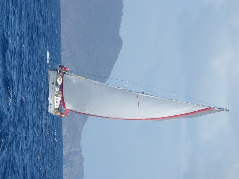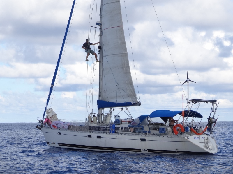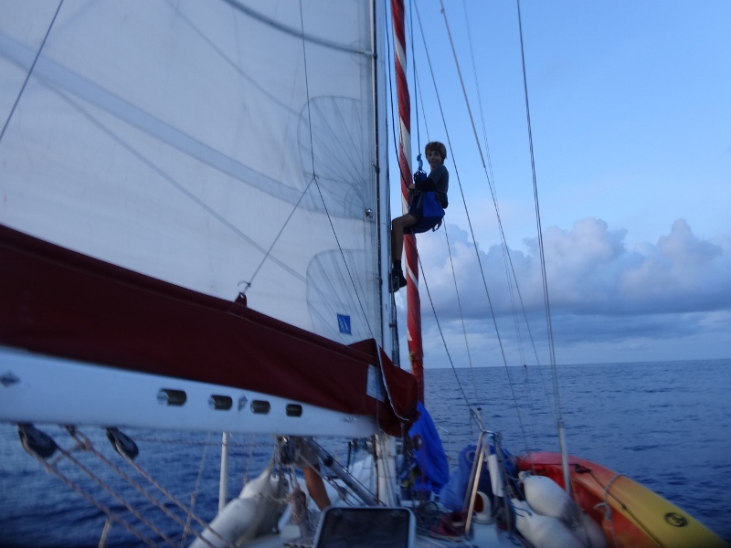 Hier, une petite frayeur : Méléos a constaté qu'un bas hauban a commencé à se détoronner. Du coup nous avons ralenti car Séb a du monter au mat pour bricoler une solution de secours.