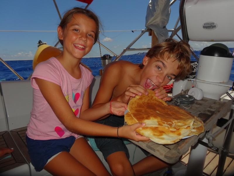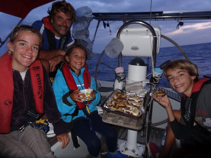 Nos estomacs ont été mis à rude éprueve ces derniers jours. Le fait qu'ils jouent aux montagnes russes a permis de nourrir quelques poissons ! Il n'y a que Loïc qui a tenu le coup, comme si de rien n'était. Du coup, il gère le quotidien (cuisine, vaisselle...). Heureusement !!!