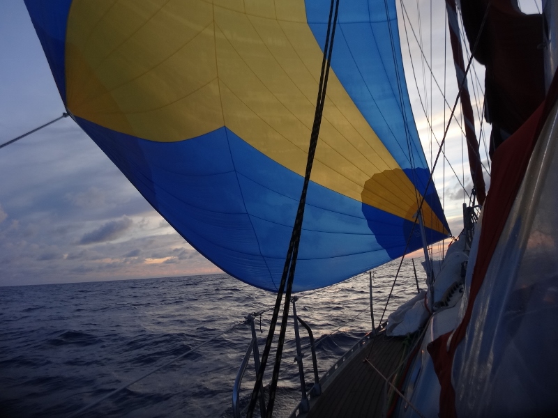 La lune en est à son dernier quart. Il y a quelques étoiles et quelques nuages. La mer est calme, et le vent souffle doucement. Nous glissons sur l'eau avec le spi (voile légère et colorée pour vent arrière). Quelle agréable sensation !